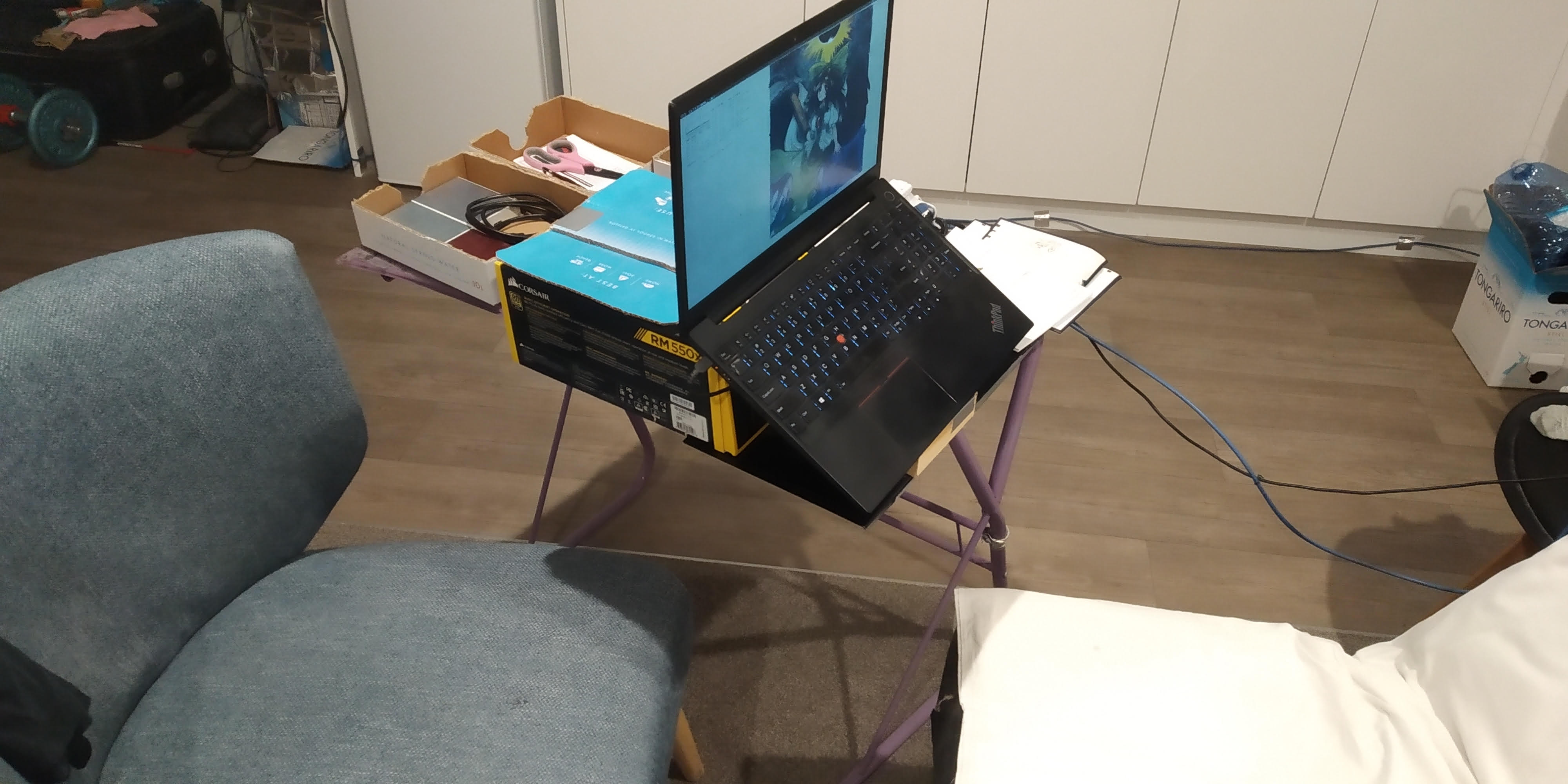 You guys really disappoint me with your copypasted setups. Failure of imagination: the thread.Here's what peak performance actually looks like. blue cable goes to the stationary pc for grafix heavy stuff(i don't use cases, they actually increase dust accumulation and noise). I'm typing right now cross-legged with my right foot on that chair. Laptop support may look flimsy(yes it's just 2 small cardboard boxes), but it's actually reinforced with superglue and duct tape. I like to be able to curl up into a ball or lie on my chairs and to move the laptop around freely. Anyone has a more dynamic setup than mine?