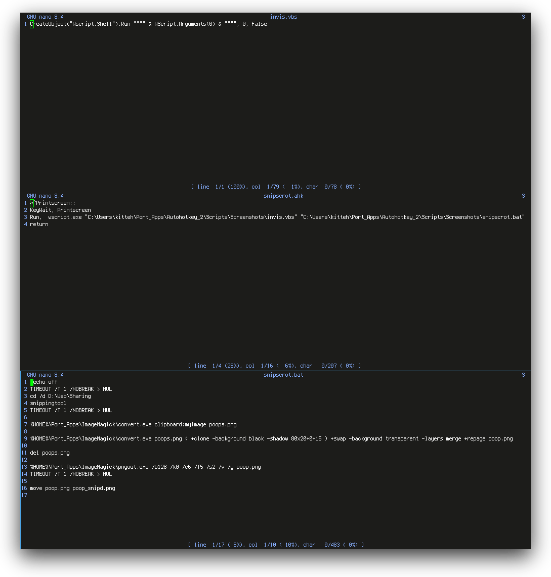 >>108508350I compiled an autohotkey script into a simple executable that opens the snipping tool and allows me to either select an area, the current window, or the whole screen. Then after I close the snipping tool(it is only used for the clipboard storage of the desired image), I run that image data through a script that calls imagemagick to apply the drop shadow, pngout to reduce filesize, and then rename the file.It sits in my notification tray and I simply Ctrl+Printscreen if I wish to take a screenshot. You can see the blue happycat icon here: https://i.4cdn.org/g/1774240101983185.png