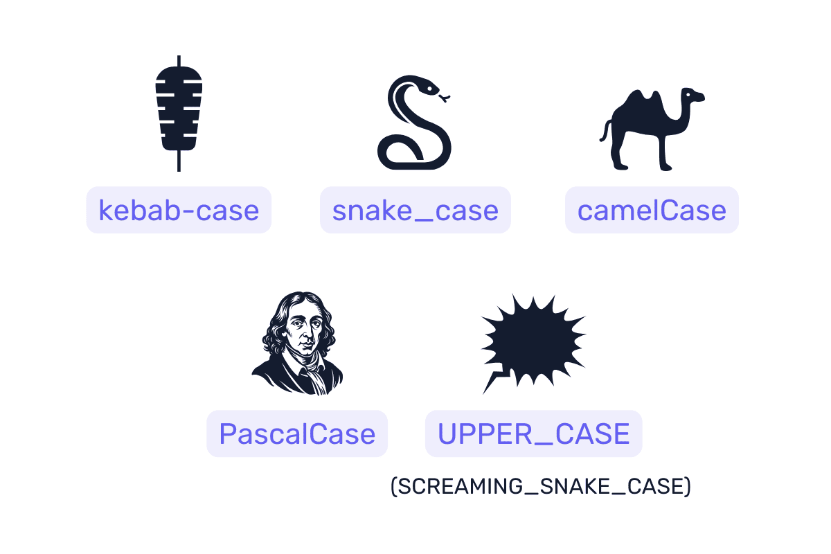 What do you use and where?For me it's:>PascalCaseClasses, interfaces, types, objects and structs>camelCasefunctions, local / member variables>snake_caseGlobal variables / environment variables>UPPER_CASEConstants>kebab-caseKeys, files and directories