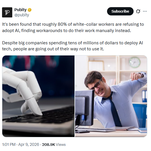 Despite big companies spending tens of millions of dollars to deploy AI tech, people are going out of their way not to use it.>"It sucks. It makes up things and outright lies">"I have to spend more damn time fixing the errors it makes because we’re forced to use it, rather than allowing me do it the first time with no errors.">"people just get frustrated with it. It's unproductive for their use cases" >"it requires more work if you have to double-check everything">"Ai just outright lies and when you feed it the docs it's like "ohh you are right let me tell you again" like are you dumb or what?">"it just doesn't work. fundamentally, objectively, it's dogshit hallucination software.">"you have to tell it exactly what you want and how you want it, which is a softcore version of you doing it.. then you have to edit and tweak. You may as well just do it yourself"