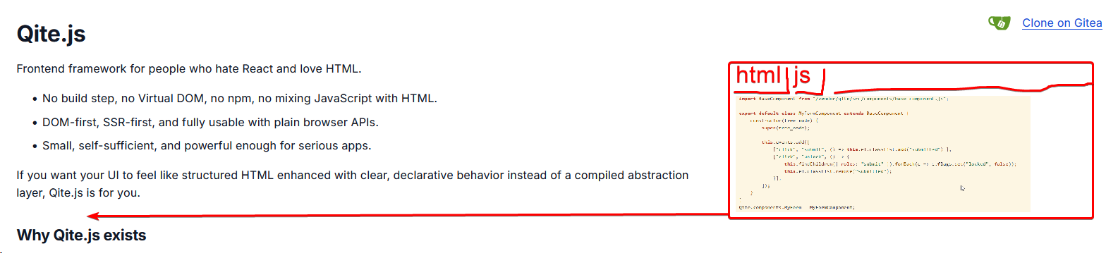 >>108588238yeah, I'm planning on reworking the intro page. The code example there is unnecessarily complex. I thought the duck page really explained everything better. When I posted to HN lots of people got confused with the intro, thought Qite is some kind of jQuery. I don't know, it's all pretty clear in my head, but it's hard to write an intro page that appeals to others.