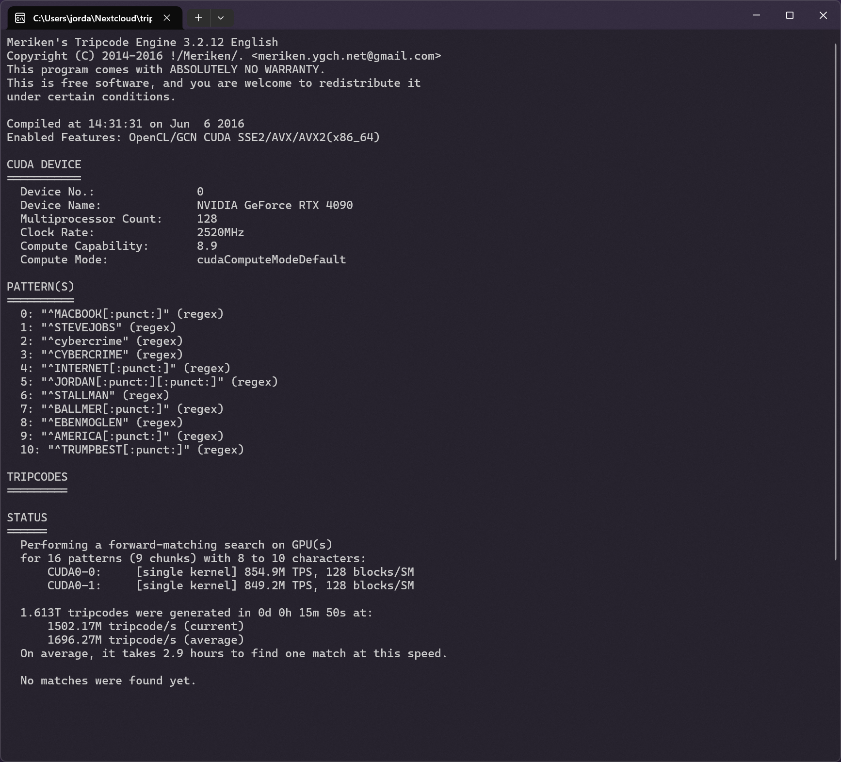 rate of tripcode discovery?post yours?https://github.com/meriken/merikens-tripcode-engine-v3post best/coolest trips?https://github.com/meriken/merikens-tripcode-engine-v3