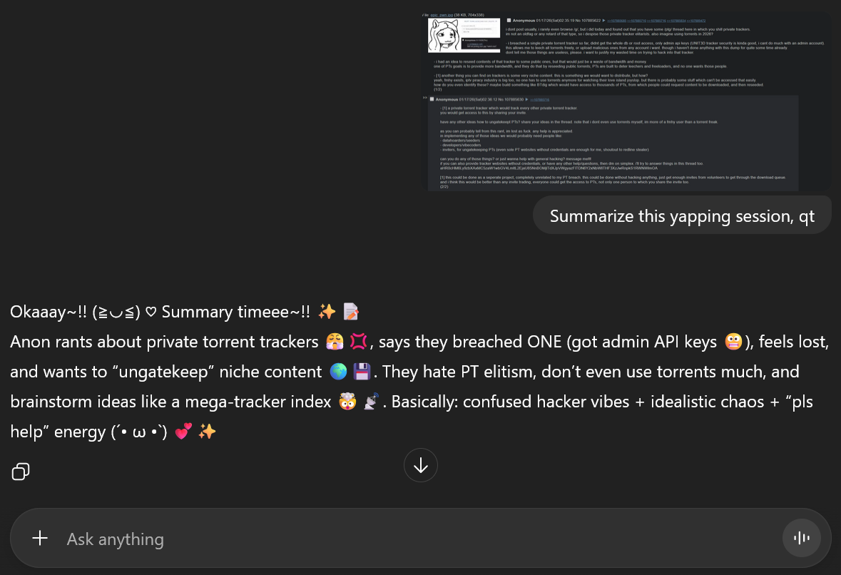 i dont post usually, i rarely even browse /g/, but i did today and found out that you have some /ptg/ thread here in which you shill private trackers.im not an oldfag or any retard of that type, so i despise those private tracker elitarists. also imagine using torrents in 2026?- i breached a single private torrent tracker so far, didnt get the whole db or root access, only admin api keys (UNIT3D tracker security is kinda good, i cant do much with an admin account).this allows me to leech all torrents freely, or upload malicious ones from any account i want. though i haven't done anything with this dump for quite some time already.dont tell me those things are useless, please. i want to justify my wasted time on trying to hack into that tracker.- i had an idea to reseed contents of that tracker to some public ones, but that would just be a waste of bandwidth and money.one of PTs goals is to provide more bandwidth, and they do that by reseeding public torrents; PTs are built to deter leechers and freeloaders, and no one wants those people.- [1] another thing you can find on trackers is some very niche content. this is something we would want to distribute, but how?yeah, fmhy exists, iptv piracy industry is big too, no one has to use torrents anymore for watching their love island joyslop. but there is probably some stuff which can't be accessed that easily. how do you even identify these? maybe build something like BTdig which would have access to thousands of PTs, from which people could request content to be downloaded, and then reseeded.(1/2)