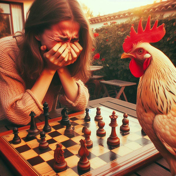 >hey Nano Banana Pro, modify the position so the woman is checkmated by Scholar’s Mate, ensure the position actually makes sense
