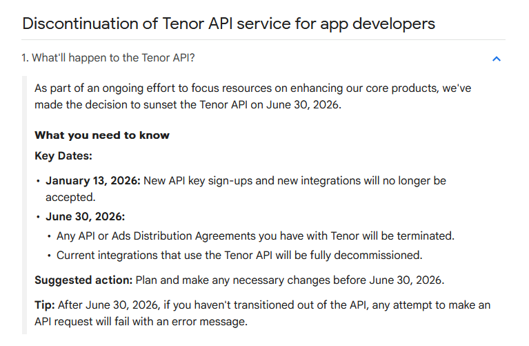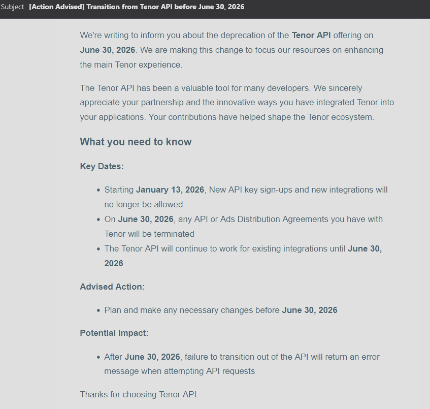 >>107867231I received an email about this because I actually use the tenor API in the app I developed.And I don't understand what they mean by "to focus resources on enhancing our core products".Basically they are just killing the site, how does that help them?
