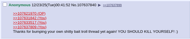 >>107621970>>107631842>>107633517>>107637809Thanks for bumping your own shitty bait troll thread yet again! YOU SHOULD KILL YOURSELF! :)