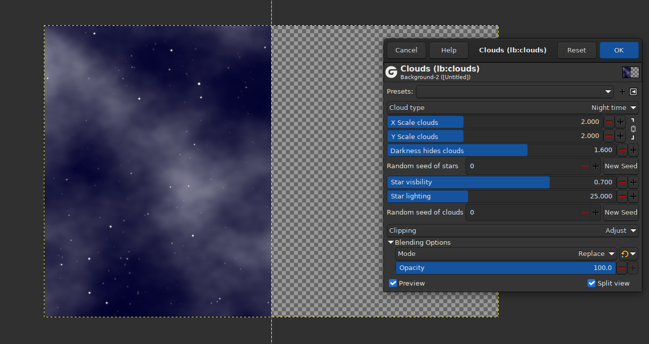 even the background stars are made of GEGL nodes chained in very complex ways. Download that plugin here. In default it draws a normal sky, because It has 3 modes, select nighttime modehttps://github.com/LinuxBeaver/GEGL-GIMP-PLUGIN_Clouds/releases/