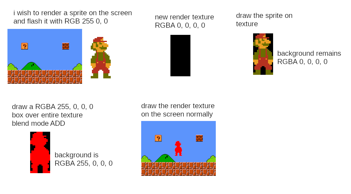 >>1071223891) Draw mario sprite on the screen with the blending I mentioned last time, this creates a zero alpha hole in the screen2) Draw a quad with solid red color (or some texture if you want) on the screen to cover the hole with something like OneMinusDstAlpha factors for source and One factors for destination (might need adjustments if partial opacities get darkened or brightned)3 optional) Draw mario sprite normally with chosen transparency to mix between textured and flashing color