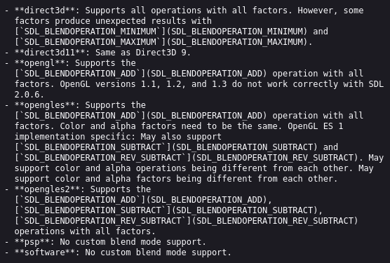 >>107122434Sadly, it seems like using SDL_BLENDOPERATION_REV_SUBTRACT in my blend mode results in an error "that operation is not supported"So it won't work on all backends it seems