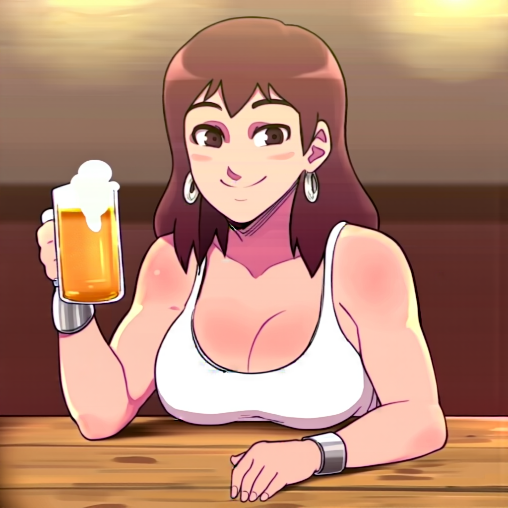 >>107115829>D-ART, D-ART Style, @18dart5, 18dart3, 18dart2, 18DART1, !!, ??, hd, high quality , clear drawing of a young girl with shoulder-length brown hair and light skin, sitting at a wooden bar table. She wears a low-cut white top that accentuates her large breasts and small hoop earrings. She smiles gently at the camera, holding a glass of amber beer with a foamy head. Her right hand rests on the table, and she wears a silver bracelet on her wrist.