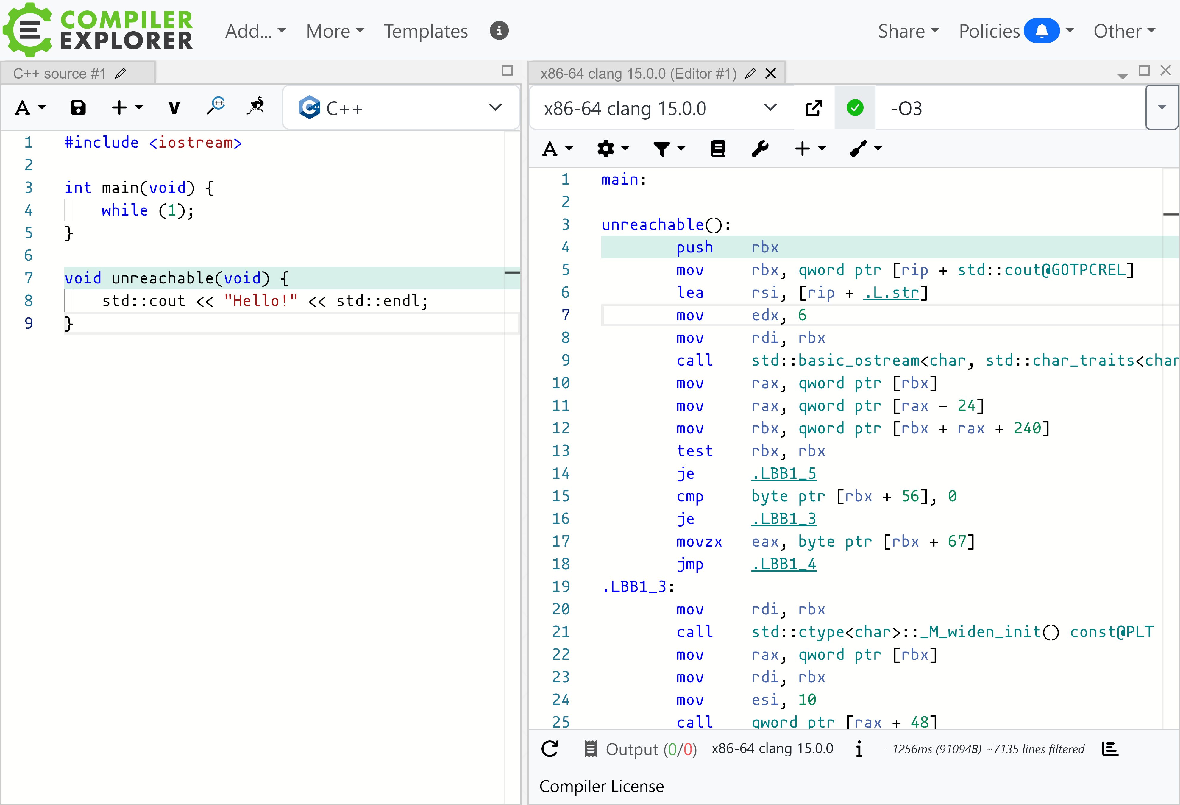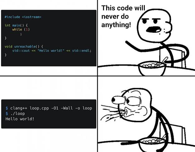 >>108261201Can somebody explain to me how the line gets printed? I get that the infinite loop is optimised away (dumb, but whatever), but how is the print statement run? It's in a separate function that's never even called