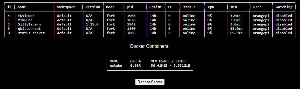 >>107854855pic related is the "experimental" OPi server. MDViewer is a custom Rentry viewer I vibecoded up. Status-server just shows what you see plus some other stuff. I'm graduating on to a chinese X99 / Xeon home server that I'm setting up to do minecraft server plus later some other things. But this OrangePI 3B with 64GB EMMC has been rock solid and only uses 15W. I've another SBC as NAS (OrangePi 3B) with a 1T M2 drive stuck underneath that just does storage and is connected to all the TVs / etc in the house. It's connected via LAN. The others are wifi only.