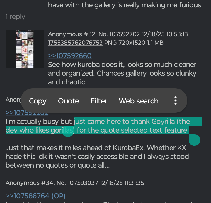 >>107592262I'm actually busy but just came here to thank Goyrilla (the dev who likes gorillas) for the quote selected text feature!Just that makes it miles ahead of KurobaEx. Whether KX hade this idk it wasn't easily accessible and I always stood between no quotes or quote all...
