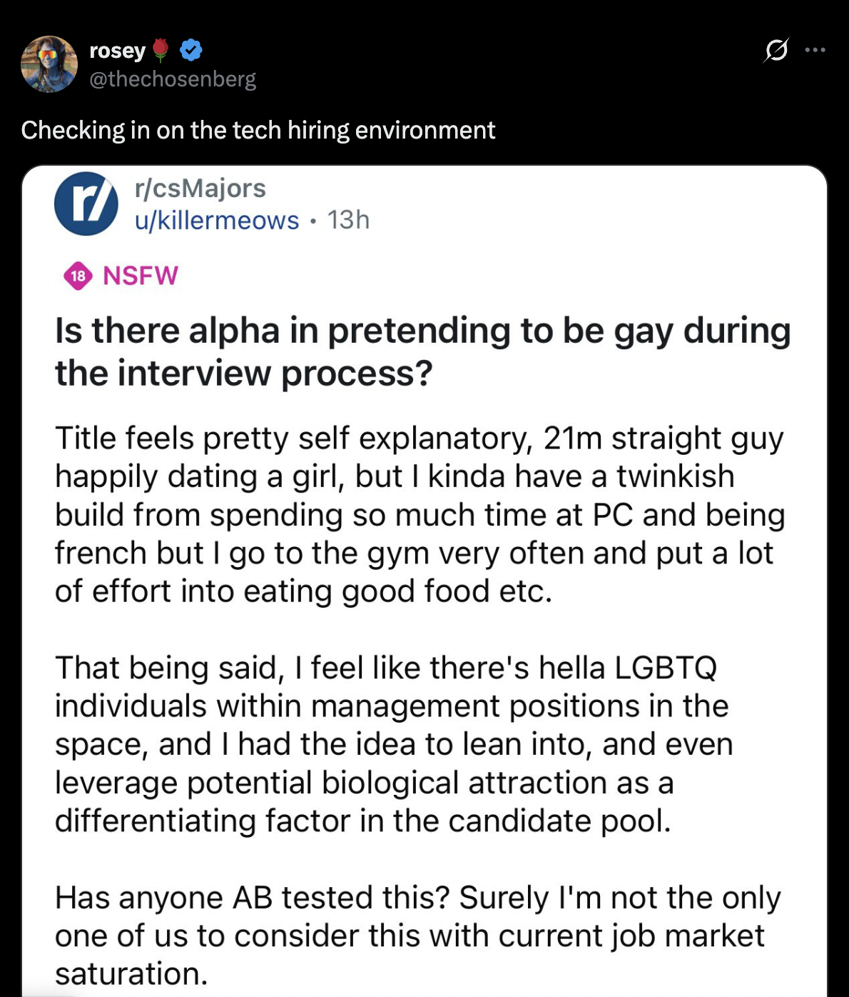 How bad is tech market if people are attempting to larp as a gay guy to get hired