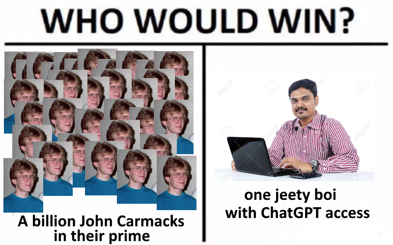 >>107996512The billion John carmacks would kill each other over pizza and coca cola, each John Carmack needs a full pepperoni pizza from Domino's per day to be fully productive and theres no way all the Dominos in the world could make 1 billion pizzas to feed them all. As soon as they start getting hungry it would be an endless bloodbath.Meanwhile Vikram just needs a woman who will make him rice and curry and who he can also rape every once in a while and he's happy