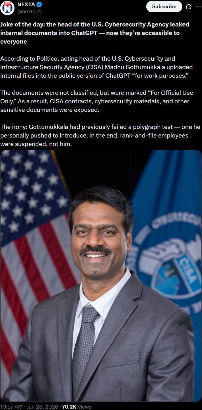 >>107996930yes, it's an exceptional american's name>n December 2025, Politico reported that Gottumukkala had requested to see access to a controlled access program—an act that would require taking a polygraph—in June. Gottumukkala failed the polygraph in the final weeks of July. The Department of Homeland Security began investigating the circumstances surrounding the polygraph test the following month and suspended six career staffers, telling them that the polygraph did not need to be administered.