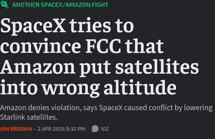>Starlink operator SpaceX claims that Amazon violated orbital debris requirements by launching satellites into initial altitudes that are too high, increasing the risk of collision with other satellites and spacecraft. SpaceX, which recently reported two Starlink satellite failures that created new space debris, yesterday accused Amazon and its launch partner Arianespace of negligence that “needlessly and significantly increases risk to other operational systems and inhabited spacecraft.”https://arstechnica.com/tech-policy/2026/04/spacex-claims-amazon-leo-launches-could-crash-into-starlink-satellites/