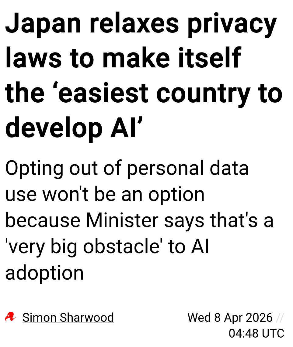 >Japan’s Minister for Digital Transformation Hisashi Matsumoto has declared the nation will become the easiest place in the world to develop AI apps, thanks to legal changes that mean organizations won’t need to secure consent to use some personal information.>To make that happen, Japan’s government on Tuesday approved amendments to the nation’s Personal Information Protection Act that remove the requirement for opt-in consent before sharing personal data.>The changes only apply to data that poses little risk of infringing individuals’ rights, and when developers use it to compile statistics for research purposes. Even health-related data comes under the amendments, if it can improve public health.>Facial scans are also fair game. The amendments require those who acquire facial images to explain how they handle the data, but offering a chance to opt out won’t be mandatory.>Collecting the image of a child aged under 16 will require parental approval, a “best interests” test will apply when considering use of data that describes minors.>But in the event of a data leak, organizations will not need to notify impacted citizens if there is little risk of harm to individuals.https://www.theregister.com/2026/04/08/japan_privacy_law_changes_ai/