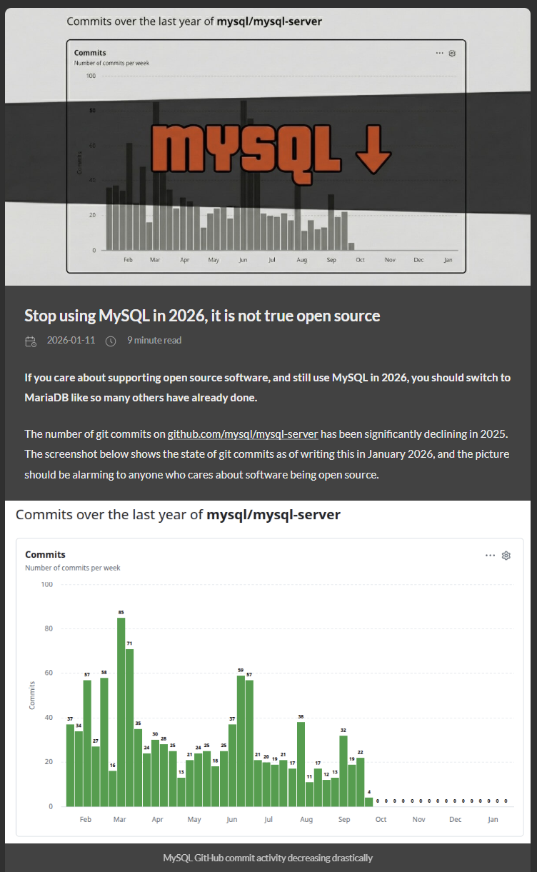 >>108067615>mariadbis it really? I ran their script for migration prep and it flagged a bajillion items I didn't even bother to read and I run so much legacy shit that I don't want to risk a borked migration