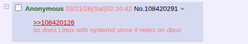 >>108418080debian was created by a guy that killed himself, i don't think archlinux was created by a guy that killed himself.so doesn't that mean that debian is the real tranny distro?or maybe, trannies don't want to be trannies, so instead they're revolting against the tranny makers by becoming their arch enemies...arch linux.Arch Linux is the antitranny distro, and I'm here for my trannybros in their revolt