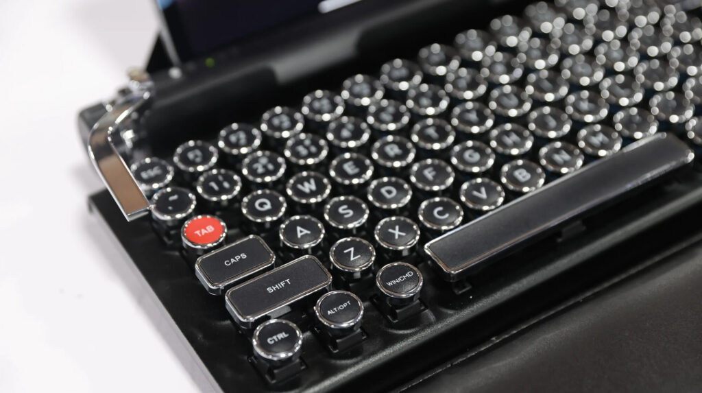 a keyboard which looks like 1890s typewriter by the shape of its keys but on the other hand the color theme is from 1980s Keytronic keyboards which were popular PC keyboard in Europehttps://muropaketti.com/tietotekniikka/tietotekniikkauutiset/nostalgiannalkaan-olisi-nyt-tarjolla-kirjoituskonetta-muistuttava-nappaimisto/THIS typewriter look-a-alike USB-C keyboard has one weird trick: it has a small speaker innit. When enabled (there is switch on the back to enable or disable) the speaker plays typewriter key-hit sound everytime you hit a key, with a 0.5 second delay or so, its not exactly simultaenous with a key hit and it wasnt simultaneous in a mechanical typewriter in 1890 either.The reason for disabling it because some people may not like the idea or at least dont like it when typing late at night with some neighbors behind thin walls.Typewriter had mostly the same keys as a PC keyboard except it didnt have function keys, this typewriter replica of course has function keys because they are quite important on PC.Can you write Finnish/Estonian/Swedish with it? Not easily as it doesnt have keys for ä,ö,ü, å, ũ.