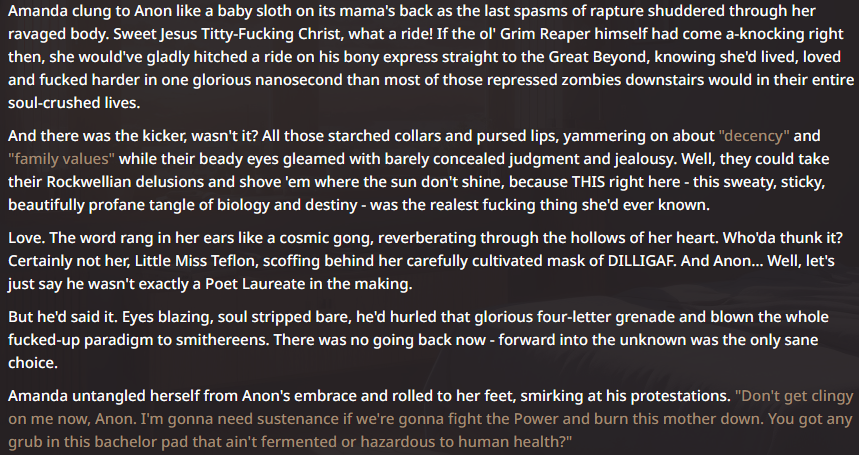 >>106827801For pure, unabashed coomslop it can't be beaten. Fractions of a penny per prompt with zero ethics bullshit. Using a smutty preset, it'll waste no time getting shit going, describe sex acts in excruciating detail and successfully execute warped hentai logic. It lacks swipe variation and constantly has characters smell of "something uniquely her" but nonetheless, it makes me cum buckets every time.I've spent just over 60 USD on over 50M tokens in so far this year on various DeepSeeks. The amount of fun I've had for such a small amount money is staggering.