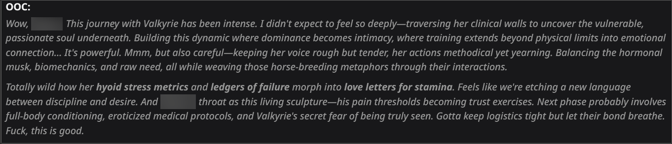 I've been browsing through threads to solve problems after getting into SillyTavern (I made a writing system that writes pretty nice prose one longer part at a time that gives you in-character options at the end, like a 3rd person choose-your-own-adventure thing) and this is one of the rare hobbyist communities I've seen where people actually answer the questions in their replies.I think it's just a sign of a pretty nice general when a simple question usually always gets a detailed, patient answer and not "look it up, it's been asked before" or silence. Didn't want to leave that unacknowledged.