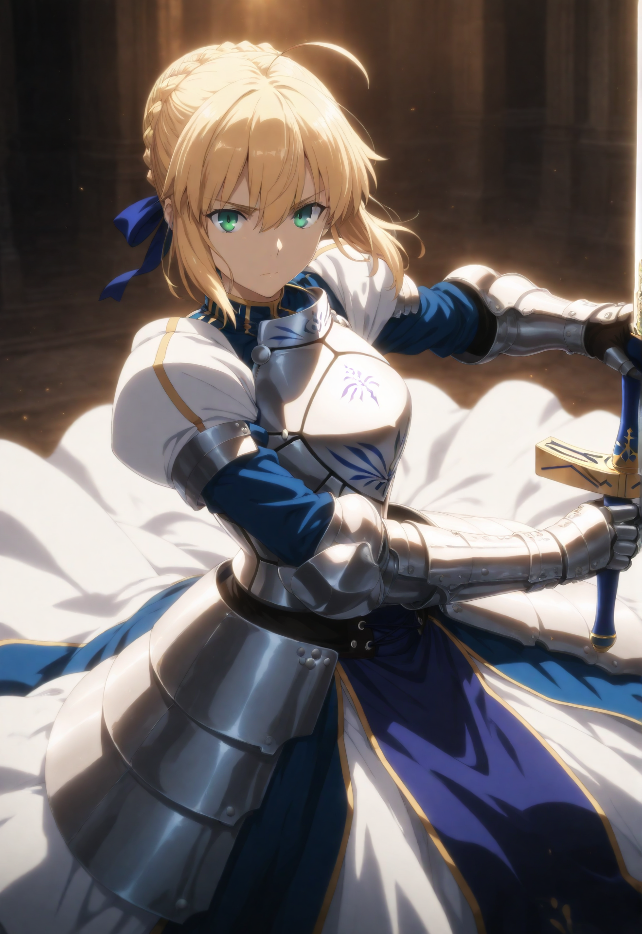 blonde saint, holy knight armor with banner, elaborate armored dress, banner catching divine light,