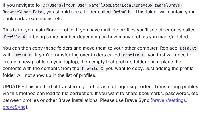 >>106866882I tried to migrate my Brave profile folder after reinstalling my OS so that I could keep my browser data and then Brave automatically deleted and purged all of my extensions. Then I read that Brave doesn't support moving profile folders to new computers and they only want you to use Brave Sync (their cloud sync service) instead for transferring data to new computers.. I uninstalled it and moved back to Firefox, which I've had no problem moving profiles between operating system installs, and it seamlessly kept the extensions as well.