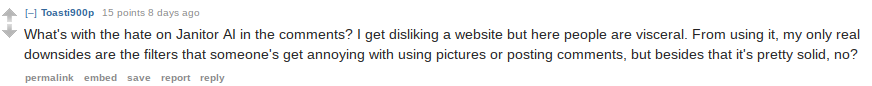 What's with the hate on Janitor AI? I get disliking a website but here people are visceral. From using it, my only real downsides are the filters that someone's get annoying with using pictures or posting comments, but besides that it's pretty solid, no?