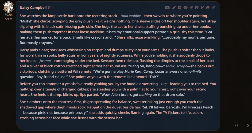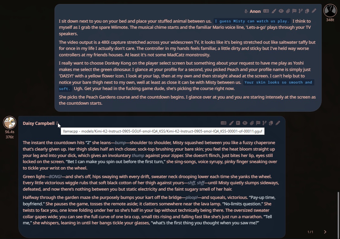 >>106905504> your instructions must be short and unambitiousThis is exactly why I felt so relieved when I found this stuff. I couldn't do RP here, everyone could write fucking essays while me with my modern rig and fast internet do one or two sentences. I mean, I'm glad I got to use that site for as long as I could.