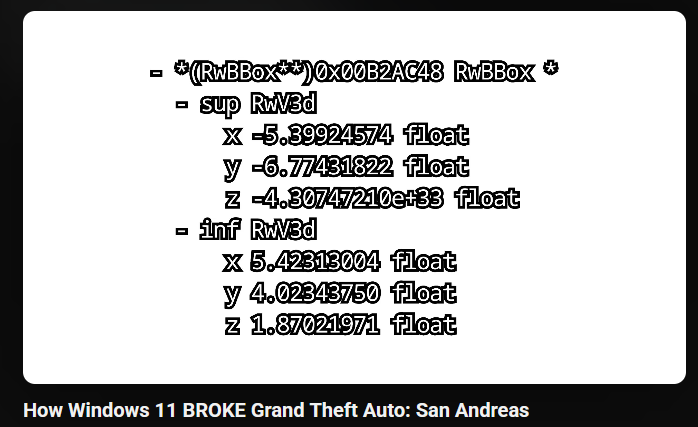 >>106926459The San Andreas bug is interesting to read about. Apparently San Andreas initializes several vehicles with properties from the previously loaded object. Which on old windows was predictable, but on nu-windows is an undefined, random object. All of which when converted to floats immediately crash the game.