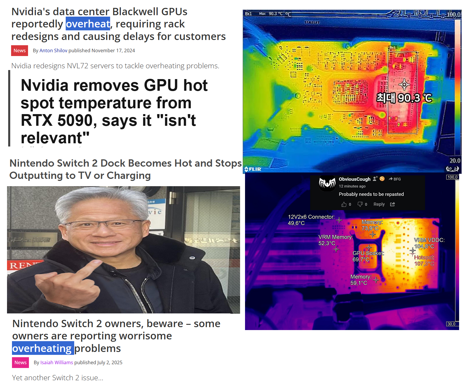 >News & RumorsRTX 50 Super: 2026 launch. 24GB VRAM for 5070 Ti & 5080 Super, 18GB for 5070 Super.>Product NoticePNY RTX 50 cards have QC issues (rattling fans, reports of 5070 & 5090 with blown capacitors)Gigabyte RTX 50 & RX 9000 video cards: thermal gel has QC issues, Gigabyte claims only early production batches were affected.https://www.igorslab.de/en/update-on-thermal-putty-on-gigabyte-graphics-cards-after-further-storage-oil-separation-to-an-alarming-extent-and-silence-as-a-strategy/>PSU Reviewshttps://www.tomshardware.com/pc-components/power-supplieshttps://www.lttlabs.com/https://www.kitguru.net/reviews/?category_name=power-supplieshttps://www.techpowerup.com/review/?category=Power+SuppliesFor tier-list enjoyers:https://docs.google.com/spreadsheets/d/1akCHL7Vhzk_EhrpIGkz8zTEvYfLDcaSpZRB6Xt6JWkc/>Storage Reviewshttps://www.phoronix.com/reviews/Storage (Linux performance)https://www.tweaktown.com/cat/storage/index.htmlhttps://www.techpowerup.com/review/?category=SSDhttps://www.tomshardware.com/pc-components/storage/ssds/reviewshttps://www.servethehome.com/category/storage/>Monitor Hunterhttps://docs.google.com/document/d/1illeNLsUfZ4KuJ9cIWKwTDUEXUVpplhUYHAiom-FaDo/