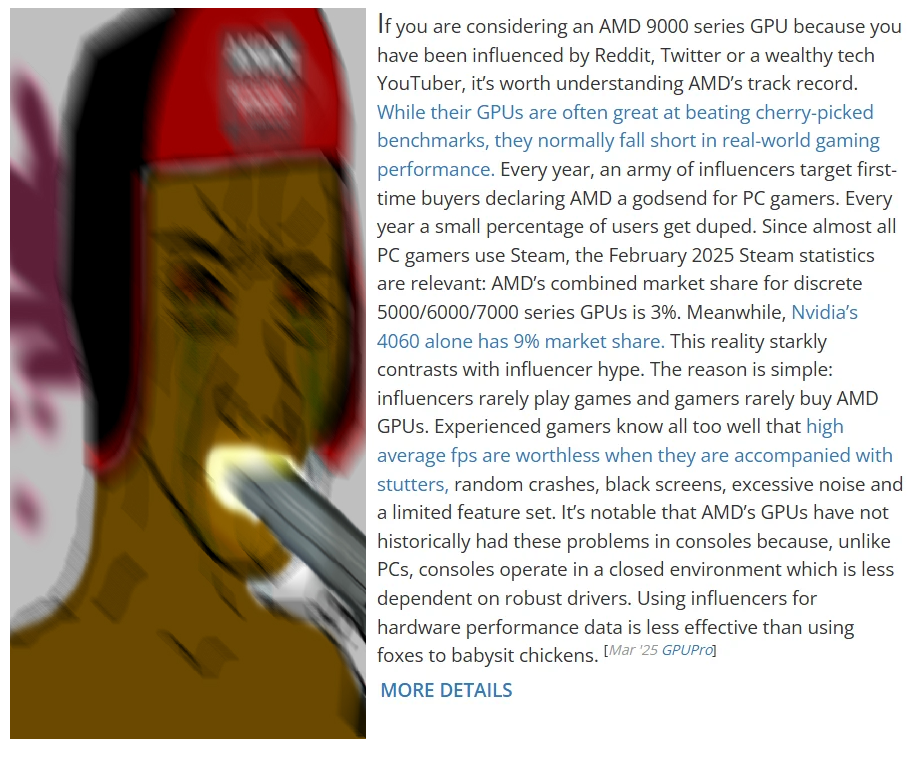 COMMON LIES BEING PERPETRATED BY TROLLS AND SHILLS ITT DEBOONKED 1/2>RADEON HAS BAD DRIVERS!!!They have been fine for years and have the same amount of problems that Nvidia drivers have or less. Most problems occur with productivity applications which is why Radeon gpus are not recommended for workstations. If you are just gaming you are unlikely to ever have any issues, especially if you only update to the latest driver when you need to.https://www.youtube.com/watch?v=-lv4-poQOyo In contrast for the first few months Blackwell had major driver issues that are only now mostly fixed. Premium day one GeForce buyers that paid the nviditax had a worse early adopter experience than Radeon buyers.https://www.youtube.com/watch?v=NTXoUsdSAnA >RADEON HAS CPU OVERHEAD!!!!It does not. Nvidishills likes to spam charts of cherry picked DX 11 games like KCD that do not play well with radeon but in reality if anything Nvidia has a worse overhead in CPU limited scenarios. Screenshot and videos below for proof.https://imgur.com/a/A5MIHM6https://www.youtube.com/watch?v=JiElNex2OC0&t=210sRadeon "CPU Overhead" in Warzone chart that the Nvidishill used to spam debunked: https://imgur.com/a/yy3MZRS>9000 SERIES MSRP AND SUPPLY WAS A LIE!!!Nvidia normally supplies over half of the market, this time they made almost no GPU's and AMD despite making a large amount of cards is unable to fufill all of this demand effectively. The result is a low supply high demand market and increased prices. However besides the US which is also impacted by tariffs the 9070 XT in many regions with some effort can be purchased for around 700 dollars or less. The card will likely go back down to MSRP around January next year when the Supers from Nvidia come out to remain competitive.