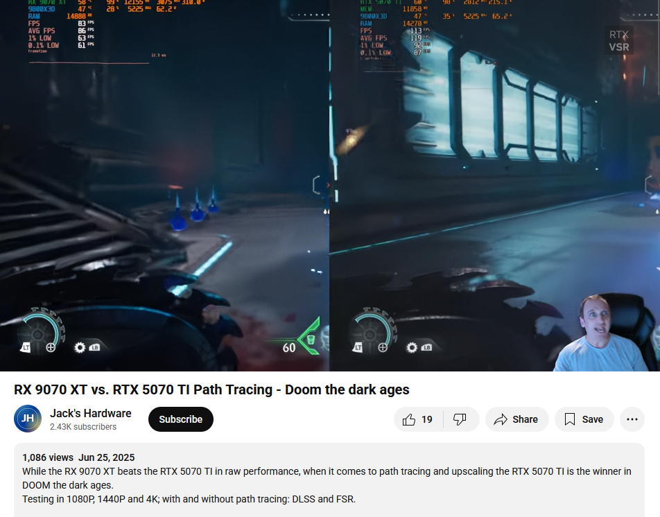 >>1069607352/2>FSR4 IS IN NO GAMES!!!Almost every game that has upscaling can be easily modded with Optiscaler to support FSR4. The result is better than native image quality in games with bad TAA. Cyberpunk 2077 before native support was added could be modded with Optiscaler, the game can run ultra RT at 80-90 fps and 50-60 fps pathtracing with good image quality using FSR4 on quality mode.https://www.youtube.com/watch?v=RNzI-TBV--A https://github.com/cdozdil/OptiScalerNative FSR4 integration will get better into the future with many games planned to have support added this year. Because of AMD's collaboration with Sony on Project Amethyst and PSSR it's likely that all future games with a console release will have FSR4 on PC.https://www.pcgamer.com/hardware/processors/the-amd-x-sony-collab-gave-us-fsr4-and-a-version-will-appear-in-playstation-next-year-too-having-already-started-to-implement-the-new-neural-network-on-ps5-pro/>WHERE ARE OTHER FEATURES TO MATCH NVIDIA AND WHY IS PT PERFOMANCE WORSE?!?!FSR Redstone which is coming out before the end of the year should noticeably improve Pathtracing perfomance and match nearly all Nvidia features such as Ray Reconstruction and AI Framegen.https://videocardz.com/newz/fsr-redstone-on-track-amd-promises-dedicated-presentation>ZEN 5 IS MELTING ON ASROCK!!!!!!!There is no conclusive evidence for what the cause is yet. Zen 5 and the 9800X3D in particular have sold very well and most people haven't had any issues. It's possible there was a bad batch of processors and ASRock motherboards have BIOS settings that are worsening the problem, or the fault may entirely be with ASRock, there isn't enough information to make any kind of conclusion yet. For now just avoid ASRock boards to be safe and you will likely be fine like the thousands of other people who have bought and used these CPUs for months with no problem.https://www.youtube.com/watch?v=YFYPnT_AQLk