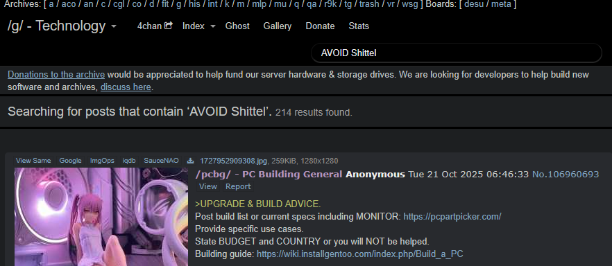 >UPGRADE & BUILD ADVICE.Post build list or current specs including MONITOR: https://pcpartpicker.com/Provide specific use cases.State BUDGET and COUNTRY or you will NOT be helped.Building guide: https://wiki.installgentoo.com/index.php/Build_a_PC>CASEmATX: AP201, Lian Li A3, O11 Air Mini, XT M3, CH260ATX: XT PRO (ULTRA), AIR 903 Base/MAX, Lancool 217, Flux Pro, Y40, Meshify 3, 4000D FRAMEDual Chamber: Y60/70, Vision (Compact), Antec C8AVOID: NXZT, 'Silent' cases, fanless cases, Corsair 6500>CPUBudget: 9600X, 7600X, 7500FGaming: AMD X3DWorkstation: 9950X, 9900XAVOID Shittel>COOLERAIO: Best Value: Thermalright Frozen Edge, Mid range: Lian Li GA II Lite, Premium LCD: TRYX PanoramaDouble towers: Thermalright Phantom Spirit 120 SE, Noctua NH-D15 G2>MOTHERBOARDAvoid ASRock AM5 boards, CPU degradation issues still reported.>RAMGaming: DDR5 2x16GB 6000CL30Workstation/high end: consider 2x32GB>SSD (OS drive)Budget: NM790Mid range: SN7100Premium: SN850XFlagship: SN8100>GPU1080p: RX 9060 XT 16GB, Poorfag Esports Gaming: Used GPU between $100-$2501440p: RX 9070 XT, RX 9070, Budget: RX 9060 XT 16GB4K:Used RTX 4090, RX 9070 XTWorkstation: Used RTX 4090 or RTX 3090 tiAVOID RTX 50 Series: False advertising "5070=4090 performance!!", unsafe power connector, broken drivers, overpriced compared to RDNA 4 in most regions, threatening reviewers, manipulating and faking reviews, evil anti-consumer company etc.ALWAYS pair AMD GPUs with AMD CPUs for SAM https://imgur.com/a/6XSNJ9b>PSUhttps://hwbusters.com/best_picks/best-atxv3-pcie5-ready-psus-picks-hardware-busters/>MONITORhttps://www.rtings.com/monitor>CASE FANSMeta: Case with good stock PWM fansMid range: Arctic P12/P14 (Max) (5-pack)High end: Noctua NF-A12x25, Noctua NF-A14x25 G2Prev: >>106952182