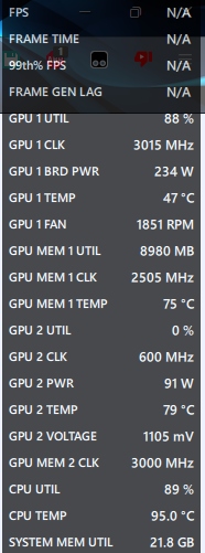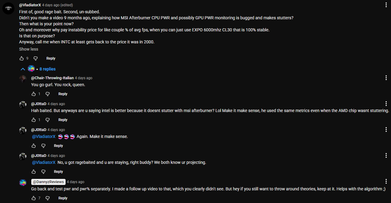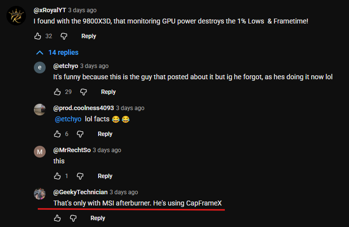 >>106965186>power % doesn't even seem to exist on AMDThe Afterburner maintainer (Unwinder) pulled the "Power %" sensor that's hidden in NVIDIA's driver; it's practically a deprecated sensor that shouldn't be enabled to begin with.NVIDIA's first-party performance overlay in the NVIDIA App doesn't use this GPU Power % sensor.Pic shows the cost of running that sensor between AMD & Intel CPUs, it will fluctuate between 8~20ms if you leave it on, haven't seen the 50ms peak he mentioned.The 14900K's frame time would've been affected if that sensor had been enabled for sure.