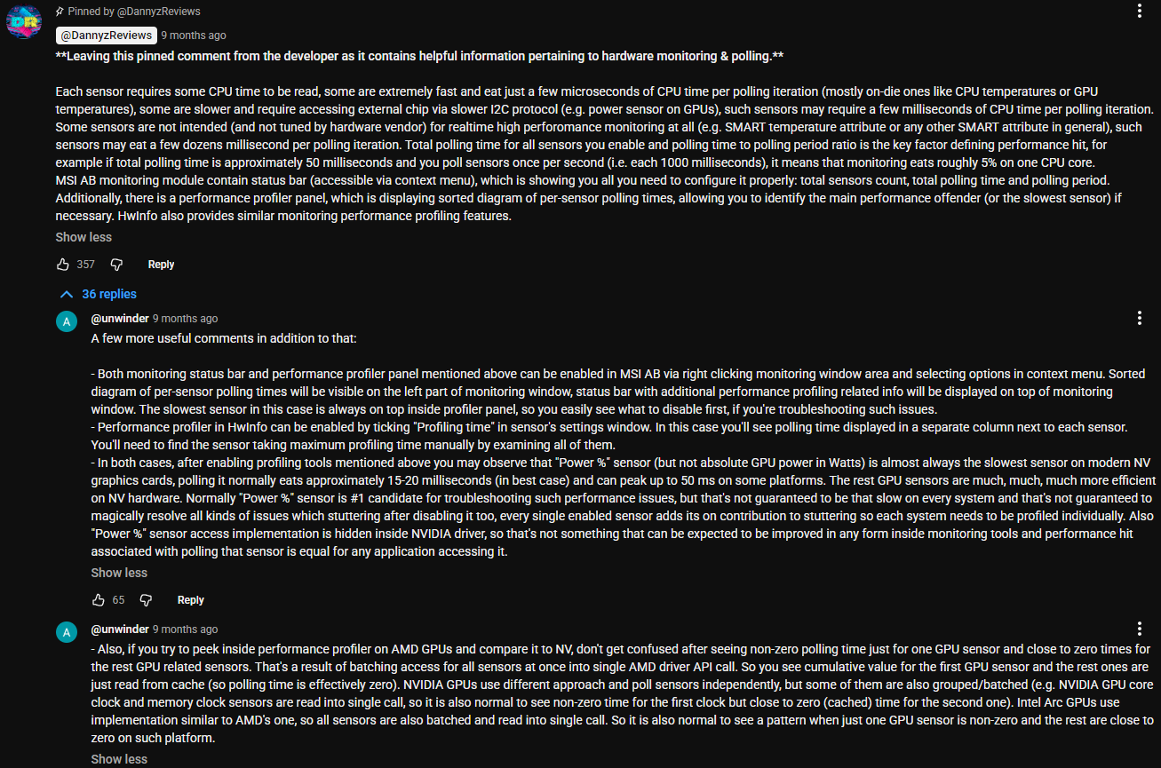 >>106965535>Pic shows the cost of running that sensor between AMD & Intel CPUs, it will fluctuate between 8~20ms if you leave it on, haven't seen the 50ms peak he mentionedyeah that's badi feel like any review using afterburner needs to have that profiler window shown from now on, at least for a few secondslol what a mess