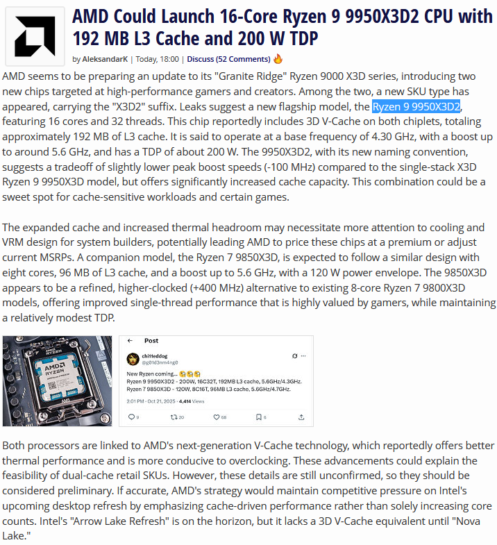 Ryzen 9 9950X3D2 - 200W, 16C32T, 192MB L3 cache, 5.6GHz/4.3GHz.Ryzen 7 9850X3D - 120W, 8C16T, 96MB L3 cache, 5.6GHz/4.7GHz.intel is so fucking done its not even a joke anymorehow did amd managed to bring an 9800x3d basicly with 400mhz on the same tdp?