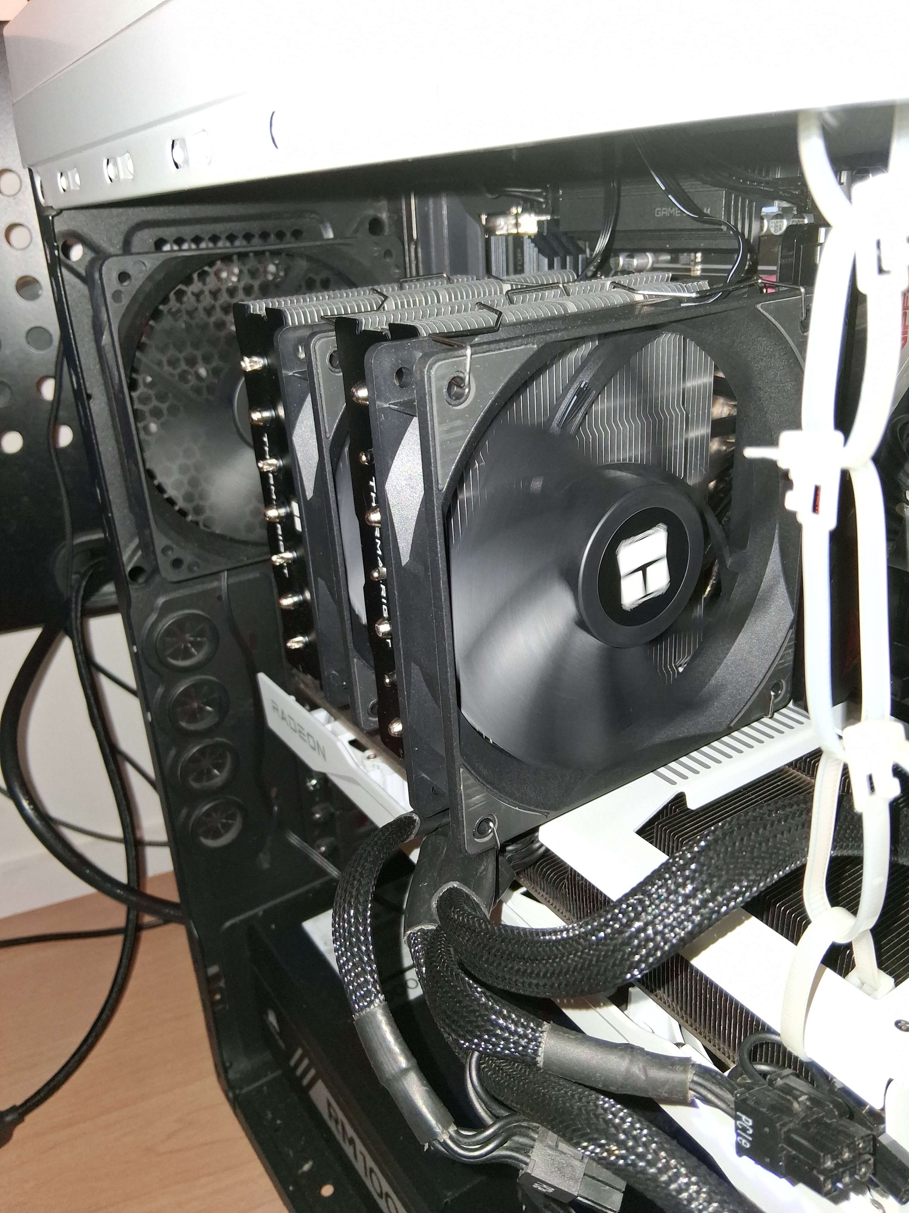 >>106964893I never had problem with thermal paste but I'm starting to wonder if I fucked up somewhere.Apparently 9700X is known to be hot but not that hot under load.>>106964929No, the flow of air is in the correct way. Fans are not in a different order. The 3 CPU fans + the case exhaust fan are pulling in the same way.>>106964963>>106964980I actually mounted them the wrong way first time refering to the usual stickers on them. When I put a thin paper on them it seems to go in the right way, towards the exhaust.If I put them the other way they blow towards the front of the case.>>106964924Full speed. Idling at 60°C. Battlefield 6 Menu I had 92°C before it maxed again slowly.
