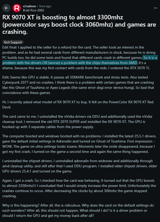 >>106966611>because it just worksNo, they don't. The 9070s were boosting too high at stock settings to the point of instability.https://www.reddit.com/r/radeon/comments/1knkvms/rx_9070_xt_is_boosting_to_almost_3300mhz/