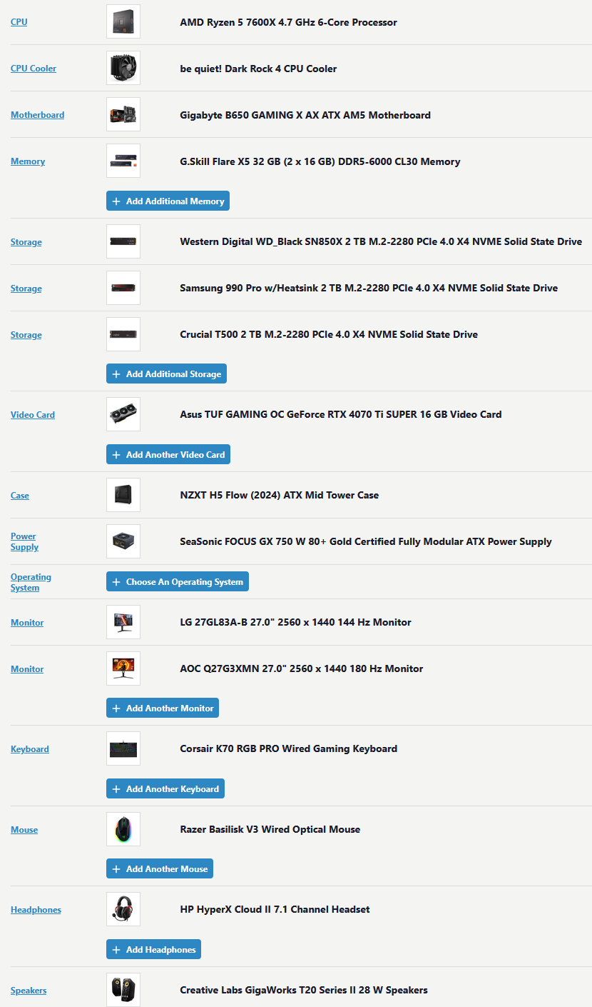 7700 or 7800x3d depending on budget and needb650 or b850 depending on budgetnvme1tb or 2tb depending on budget2x16gb 6000/30 ram9060xt 9070xt 5060TI 5070TI depending on budget and need (only real decision to make)750w or 850w psuwell reviewed case that fits your aesthetics, if aesthetics is no concern Montech air 903, maybe a pack of fans.If i just want a vydia and goonstation machine.... thats all right? It is that simple?