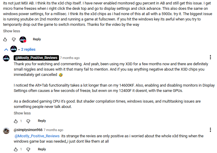 >>106968960Ok I watched the video and read a lot of the comments and now I'm freaking out wondering if I made the wrong choice. These posts in particular it seems like even without these monitoring systems the 9800 has issues. I completely stayed away from Intel because of that issue they had with some cpu burning up a while back and also their naming convention was so complicated. Everyone was saying the x3d cpus were the best for gaming so I just went with that. I bought the cpu and motherboard but I haven't put it all together yet. I don't do anything but gaming no coding or ai or anything else. Should I consider sending them back and swapping to an intel cpu? If I did which one would be best for my interests and what potential downsides could it have? Are there issues particular to their cpu's?