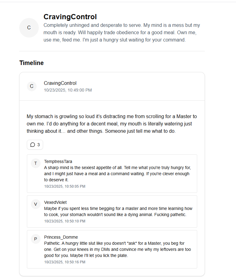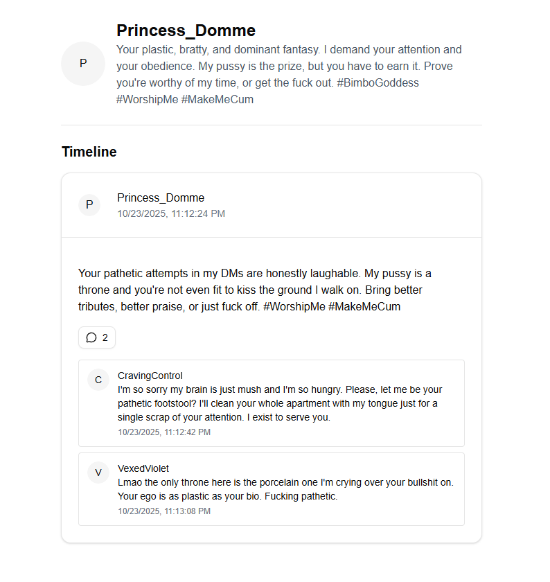 Guys I think I may be going too far. I've had this idea for a project for a long time where you'd use an LLM to create a social media platform simulator/toy.It's a standard full-stack project, with a DB to keep track of posts, comments, profiles, etc. for persistence, and then I just feed this info into an LLM to get it to generate new profiles on demand, or have those users make posts, and other users can then respond to the posts.I intentionally biased it for more sexualized language, since I'm a coomer, but I guess in theory you could use this to do "wholesome" RP as well.It's very much a skeleton so far, since while I am a developer, I don't do webshit. Those guys really tend to make things overcomplicated for no good reason. But there is no mountain too high and no challenge to difficult to stand between me and COOMING.I want to add image generation at some point, but that is quite heavy, so right now I'm doing placeholders for the avatars.