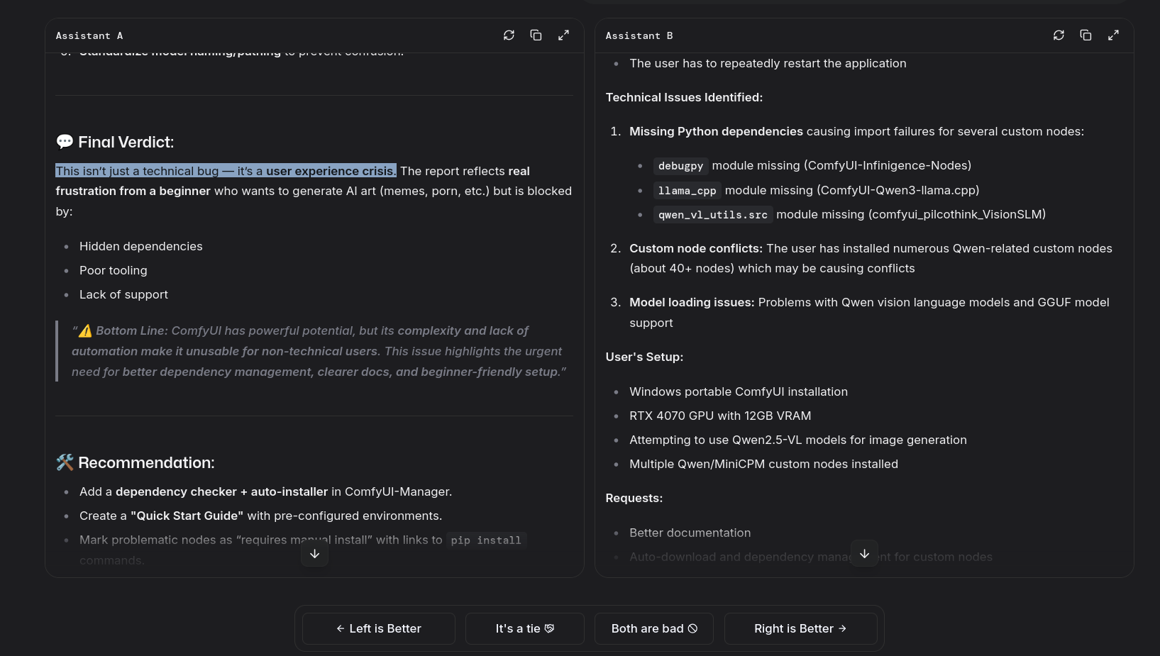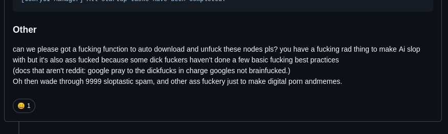 >>106989230Why does it sound like he's just now discovering that comfyui is a clusterfuck? When something goes wrong with comfyui my reaction is usually just "oh, that also doesn't work, just like almost everything else"