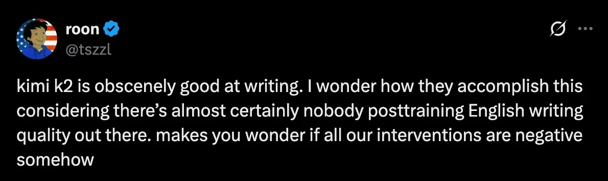 >>106993375>twitter>verified blue seal These are all influencers and marketers.Kimi k2 or whatever else the fuck is the current flavour of the month is still the same slop as any other model. It's not going to magically change one day especially with chinese models.