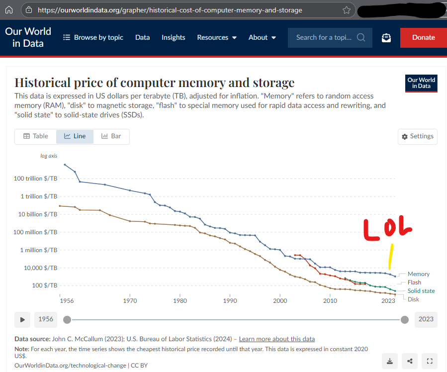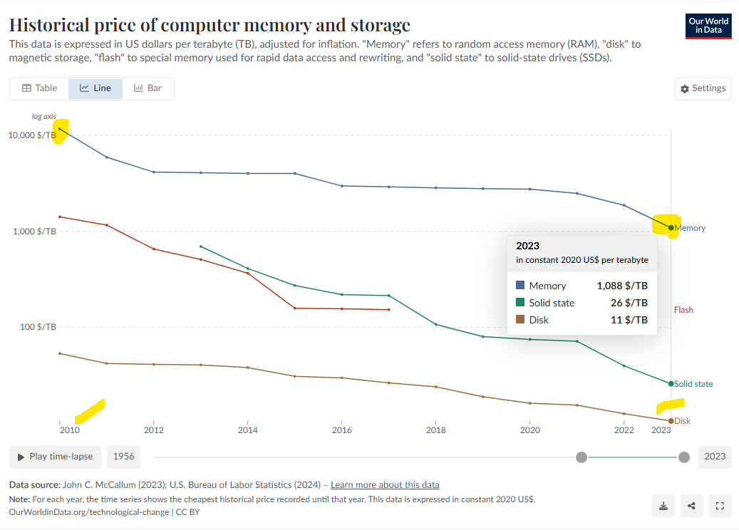 >>106993730>the price is basically never gonna come down tho. lol epic troll. Pic related is logrithmic btw$1000 for 1T high-speed RAM is probably 4 years out like >>106993496 states, if lines just keep going down, as it has for quite some time. > having a terabyte of ram will never be mainstream.something something no one needs more than 640kb ram per Bill Gates 1980We will see 1T mainstream machines with 1 petabyte drives in your lifetime.