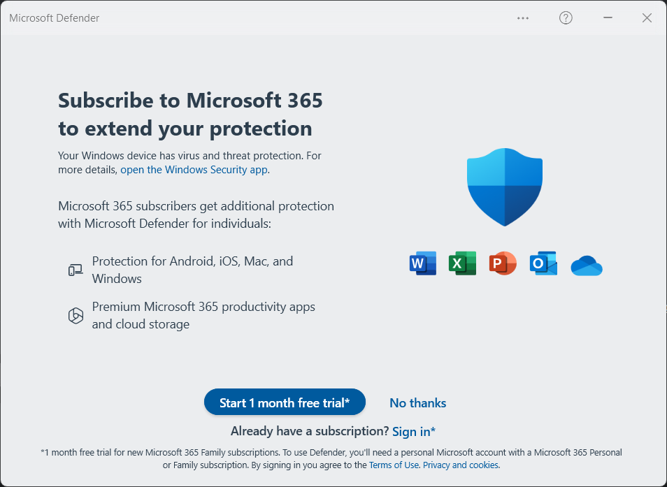 >Your Windows device has virus and threat protection>Microsoft 365 subscribers get additional protection with Microsoft Defender for individualsRetard