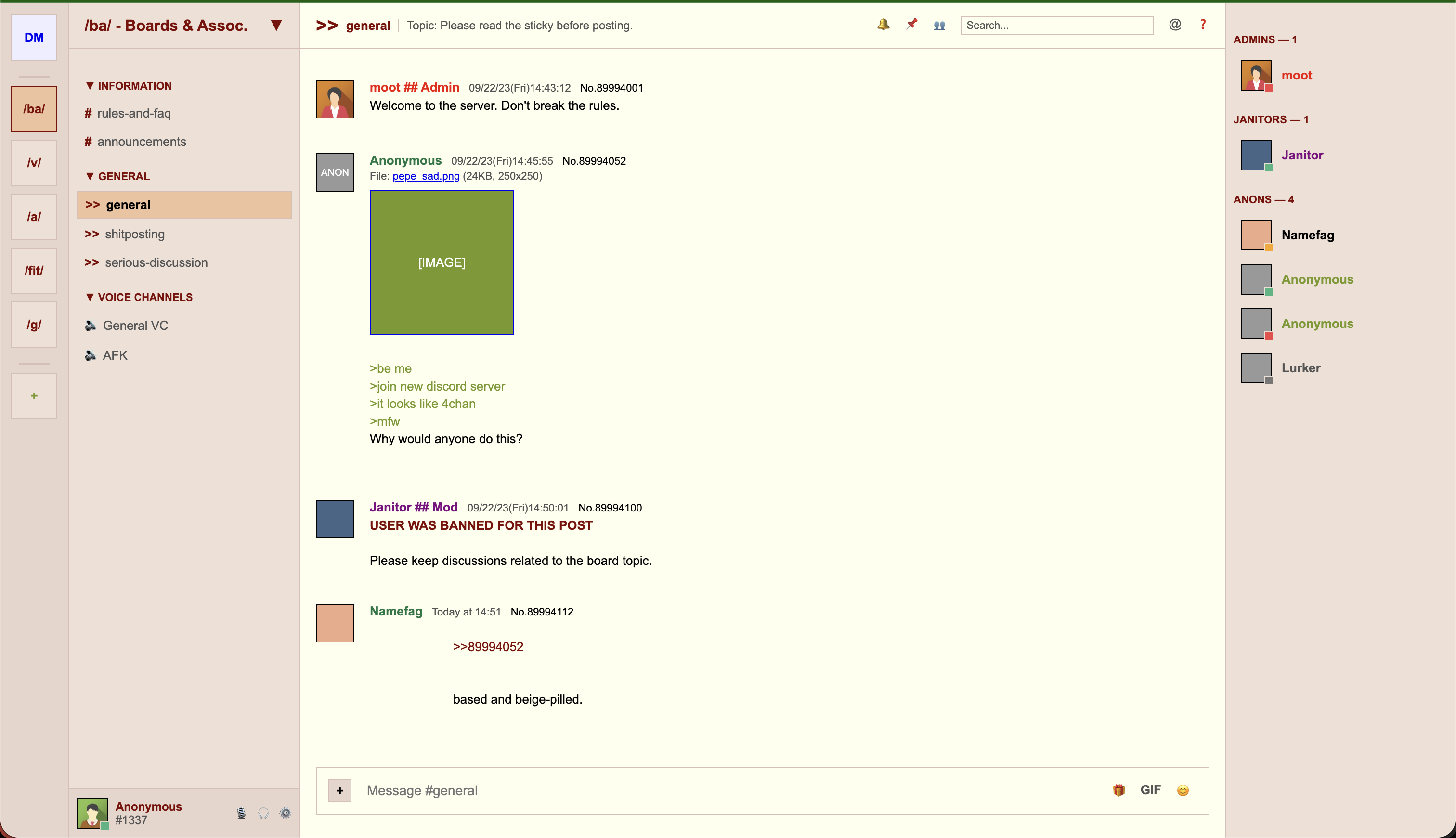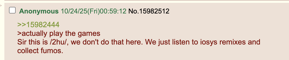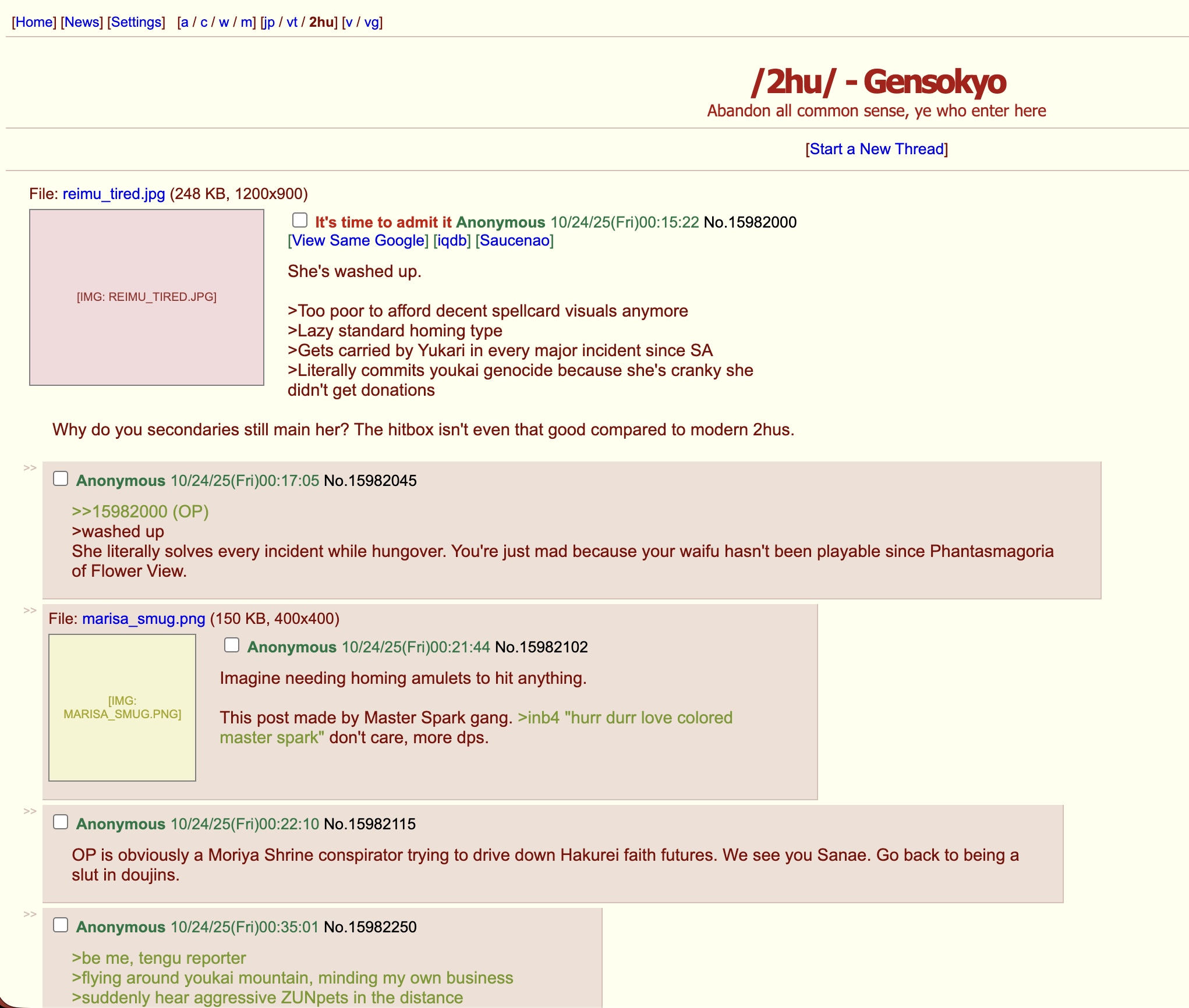 >Create a 4chan-like website (think 2010s 4chan design) but some other imageboard that's entirely about touhou characters, open in some thread with discussion. Make a really authentic style, with specifics for touhou, be creative, fill with text content, real looking posts/discussion etc, slang and so on. single htmlhttps://amber-migration-1ne8.pagedrop.io>>106987076sure, soon, i've done those before, ill make one now