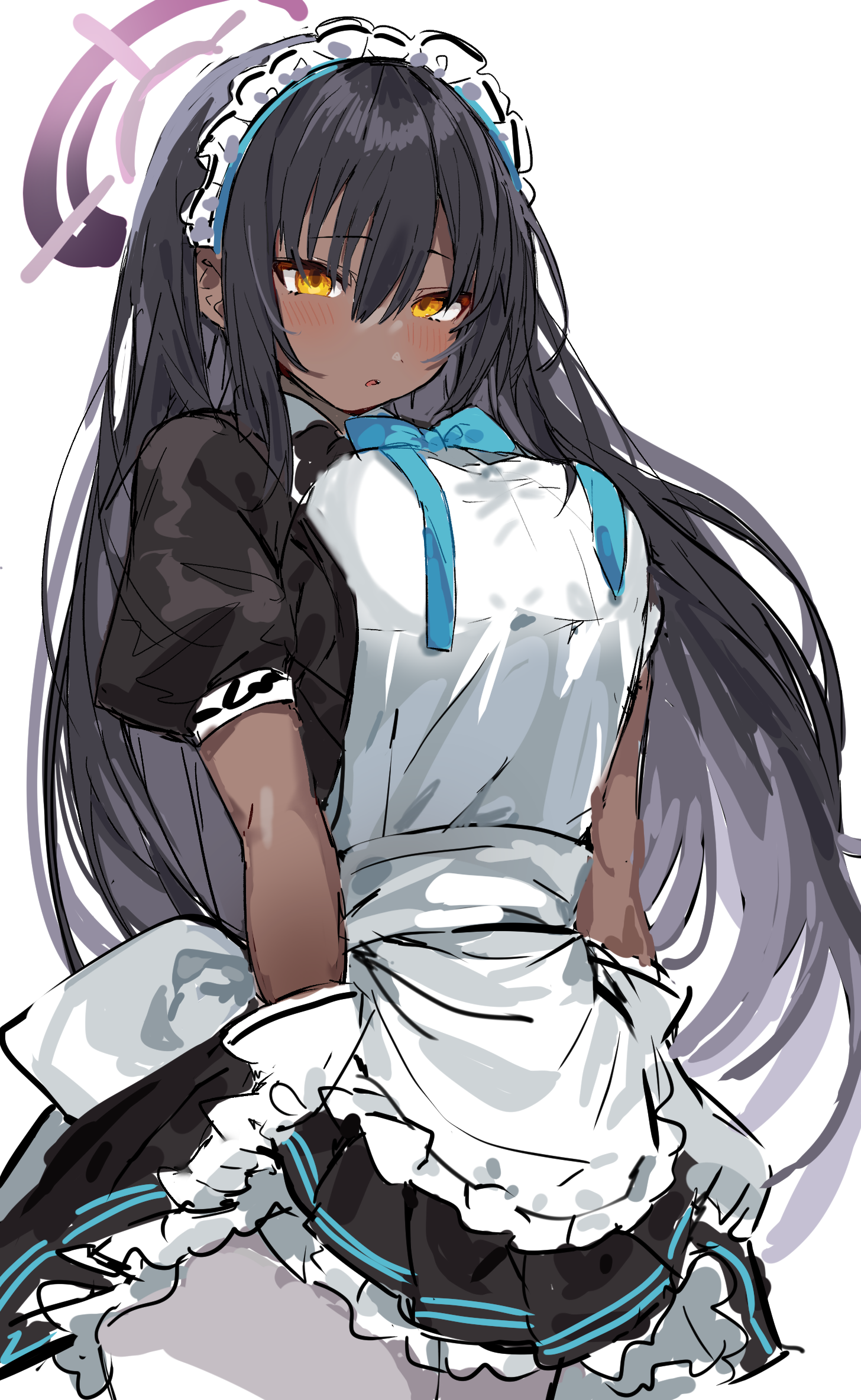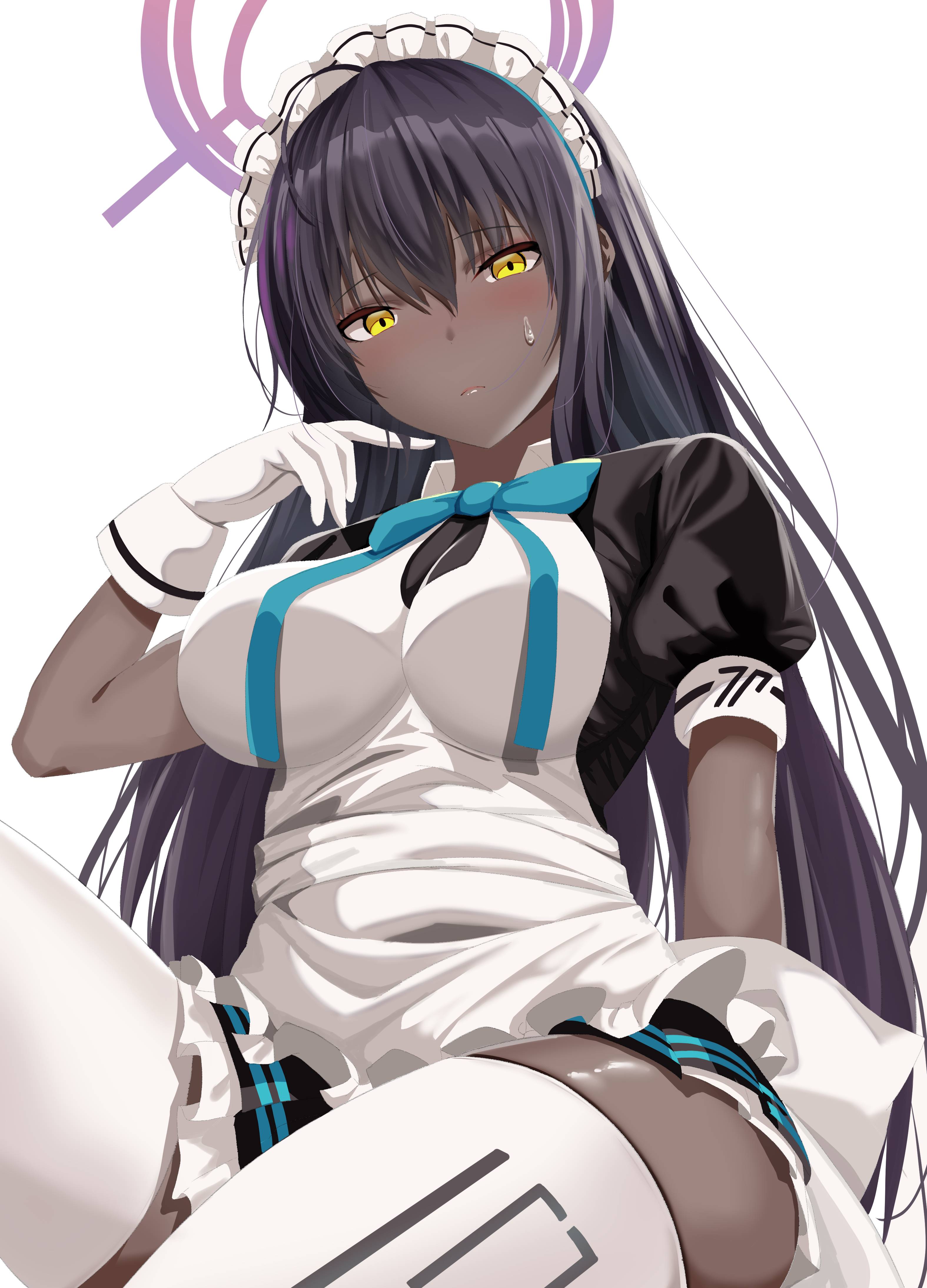 >>106987399Kakudate Karin is a prominent character from the mobile RPG *Blue Archive*. She is a student at Millennium Science School and a key agent of the secret elite organization known as **C&C (Cleaning & Clearing)**.Below is a detailed breakdown of her character, appearance, personality, and combat role.---### 1. Profile & Affiliation* **Full Name:** Kakudate Karin (角楯カリン)* **School:** Millennium Science School* **Club:** C&C (Cleaning & Clearing)* **Age:** 16* **Birthday:** February 2* **Height:** 170 cm* **Role:** Agent "Zero-Two" (02), Sniper, Fire Support### 2. AppearanceKarin has one of the most distinct and recognizable designs in *Blue Archive*, often noted for her "cool beauty" aesthetic.* **Physical Features:** Karin is tall (170cm) with a mature, athletic figure. She has a darker, tanned complexion, which contrasts strikingly with her long, straight jet-black hair that reaches down to her lower back. Her eyes are sharp and golden-yellow, often giving her an intense or glaring expression.* **Halo:** Her halo is dark grey/black, relatively small, and spiky, resembling a stylized mechanical gear or a crosshair, fitting her role as a sniper.* **Attire (Standard Uniform):** Like all C&C members, she wears a highly modified maid outfit designed more for combat mobility than actual housekeeping. * Her outfit consists of a very revealing black leotard-style base with a white maid apron over the front. * She wears a short white bolstered skirt at the back, leaving her legs mostly exposed save for white thigh-high stockings held up by black garters. * She wears detached white sleeves/gloves and signature blue and white sneakers, which are a practical choice for combat over traditional maid heels.* **Weapon:** She almost always carries "Hawkeye," a massive anti-materiel rifle (resembling a Boys Anti-tank Rifle) that is nearly as tall as she is.
